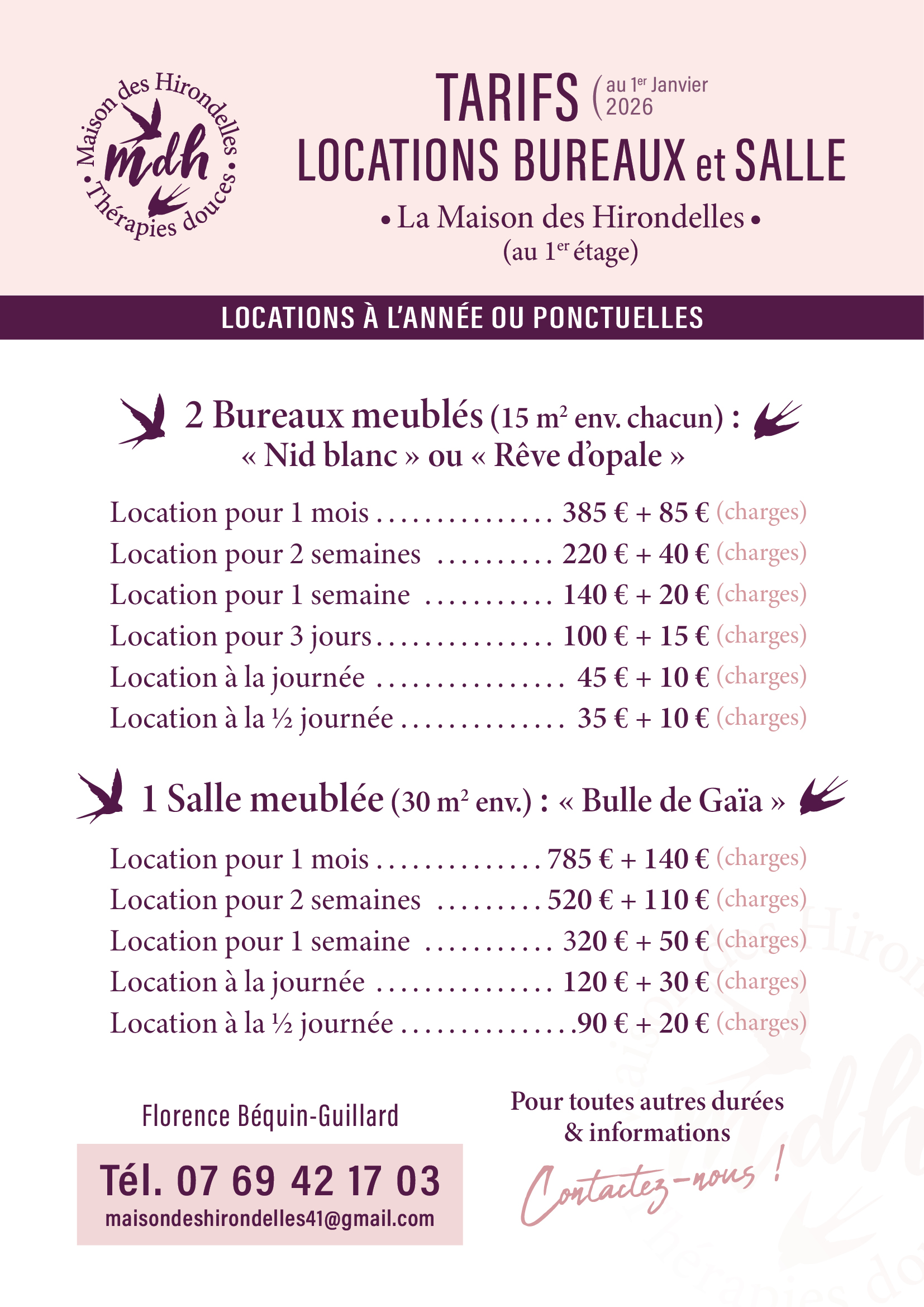 La Maison des Hirondelles, nichée dans une jolie maison traditionnelle en plein centre bourg, propose à la location des espaces, situés au 1er étage, accueillants et lumineux, pensés pour les activités liées au bien-être. Possibilité d’y recevoir du public, avec accès à une salle d’attente, un coin café/cuisine, ainsi qu’à une terrasse et un jardin arboré.